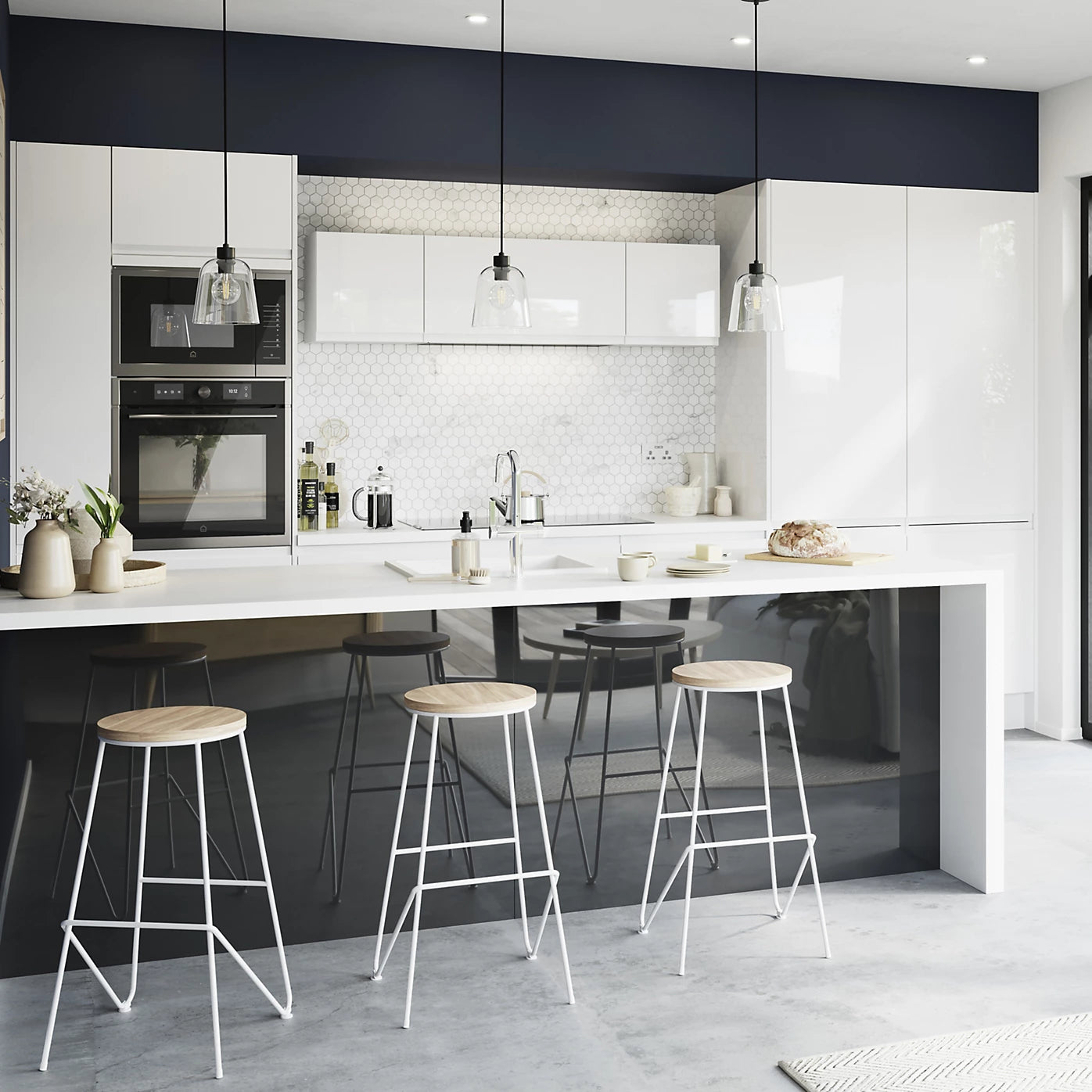 - The gloss white design of the Garcinia range will create a clean, tranquil space and make your kitchen the perfect place for winding down in after a long day. If you have a smaller kitchen, the gloss finish will make your kitchen look bigger by reflecting any light back into your space. We have designed our GoodHome worktops to complement this range, to make your kitchen a co-ordinated and stylish space.