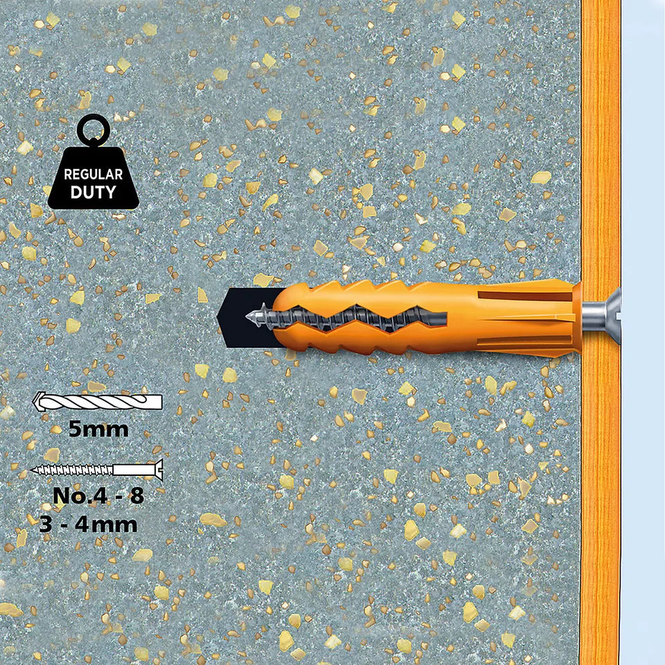 Ensure secure and reliable fixings for your projects with Plasplugs Super Grips fixings. Designed for regular-duty applications, these fixings are perfect for use on solid walls such as brick, concrete, and stone. The multi-action grip with six gripping points and expanding barrels ensures a strong and stable hold. This handy pack includes 15 yellow wall fixings, 15 screws, a drill bit, and a screw gauge, making it easy to get started on lightweight installation tasks like wall hooks, switches, and small bathroom accessories.